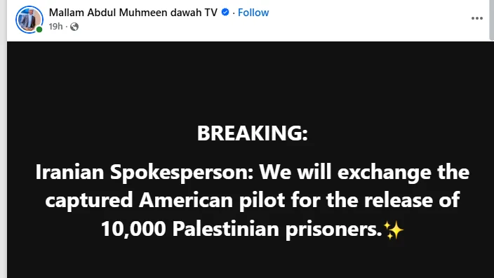 Despite the rescues, posts on Facebook, Instagram, YouTube and other platforms started claiming that Iran had captured a pilot and was offering a straight swap: one American pilot for the freedom of 10,000 Palestinians held in Israeli prisons.